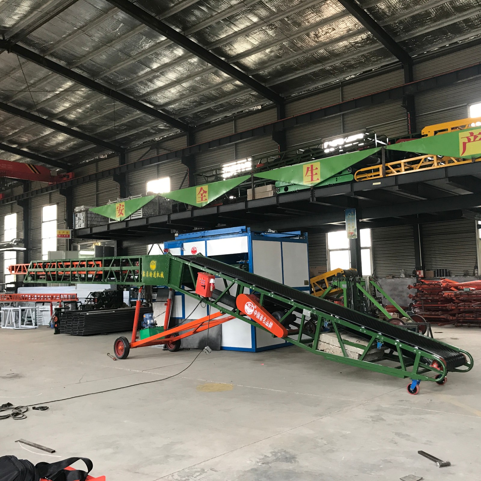伸縮式滾筒輸送機(jī)主要由以下部件組成:機(jī)頭架、驅(qū)動(dòng)裝置、驅(qū)動(dòng)滾筒、機(jī)尾架、托輥、中間架、機(jī)尾換向裝置、卸料裝置、清洗裝置、張緊裝置、皮帶存放裝置等,輸送帶是滾筒的承重部件傳送者。傳送帶上的物料與傳送帶一起運(yùn)轉(zhuǎn)??筛鶕?jù)需要在輸送機(jī)端部或中部卸料。輸送帶由旋轉(zhuǎn)托…